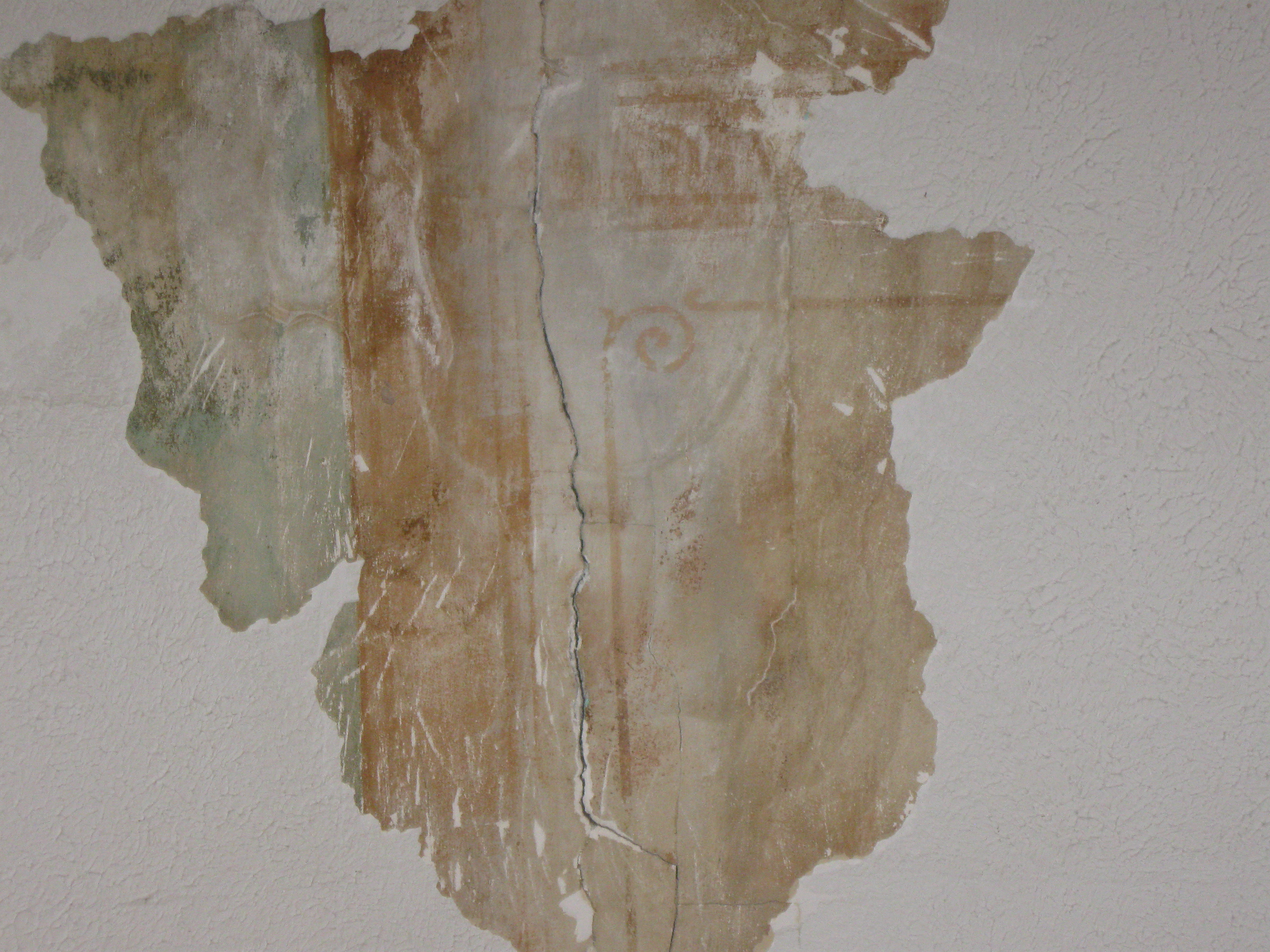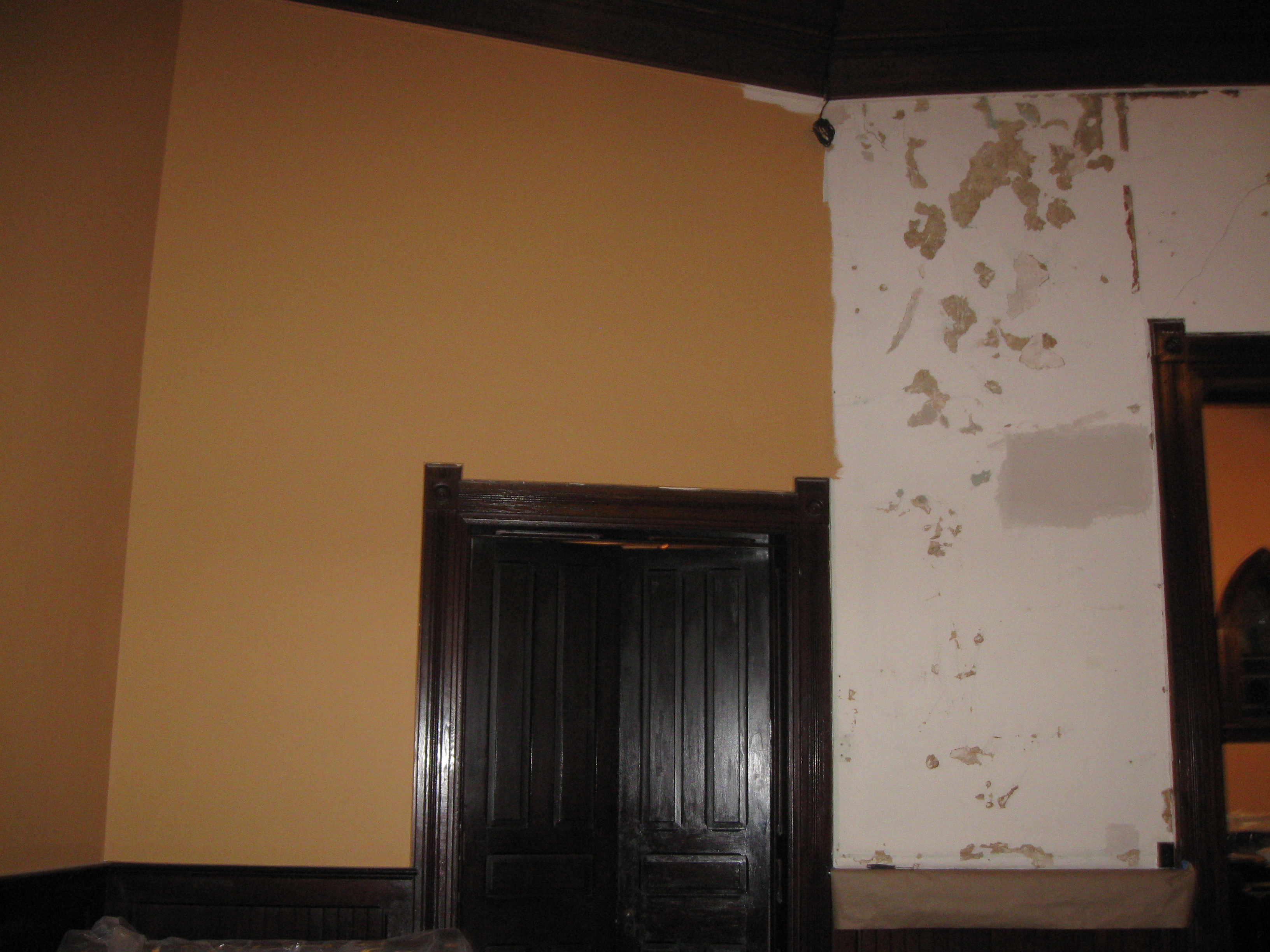 Interior plaster repair and paitning has begun. The wall color is an exact match of the original 1800's paint color. The original color was found when heating ducts were removed. Home Depot was able to accurately match the color form a plaster sample removed from the wall. The ceiling stencil is under a plaster over coat. We would like to remove the over coat and replicate the stencil on the ceiling when funding permits.
